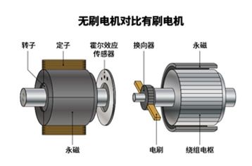 一、有刷電機的原理有刷電機采用機械換向,磁極不動,線圈旋轉。電機工作時,線圈和換向器旋轉,磁鋼和碳刷不轉,線圈電流方向的交替變化是隨電機轉動的換相器和電刷來完成的。在有刷電機中,這個過程是將各組線圈的兩個電源輸入端,依次排成一個環,相互之間用絕緣材料分隔,組成一個象圓柱體的東西,與電機軸連成一體,電源通過兩個碳元素做成的小柱子(碳刷),在彈簧壓力的作用下,從兩個特定的固定位置,壓在上面線圈電源輸入環狀圓柱上的兩點,給一組線圈通電。隨著電機轉動,不同時刻給不同線圈或同一個線圈的不同的兩極通電,使得線圈產生磁場的N-S極與***靠近的永磁鐵定子的N-S極有一個適合的角度差,磁場異性相吸、同性相斥,產生力量,推動電機轉動。碳電極在線圈接線頭上滑動,象刷子在物體表面刷,因此叫碳“刷”。相互滑動,會摩擦碳刷,造成損耗,需要定期更換碳刷;碳刷與線圈接線頭之間通斷交替,會發生電火花,產生電磁破,干擾電子設備。二、無刷電機工作原理無刷電機采取電子換向,線圈不動,磁極旋轉。無刷電機,是使用一套電子設備,通過霍爾元件,感知永磁體磁極的位置,根據這種感知,使用電子線路,適時切換線圈中電流的方向,保證產生正確方向的磁力,來驅動電機。消除了有刷電機的缺點。這些電路,就是電機控制器。無刷電機的控制器,還可以實現一些有刷電機不能實現的功能,比如調整電源切換角,制動電機,使電機反轉,鎖住電機,利用剎車信號,停止給電機供電。現在電瓶車的電子報警鎖,就充分利用了這些功能。無刷直流電機由電動機主體和驅動器組成,是一種典型的機電一體化產品。由于無刷直流電動機是以自控式運行的,所以不會象變頻調速下重載啟動的同步電機那樣在轉子上另加啟動繞組,也不會在負載突變時產生振蕩和失步。三、調速方式的區別實際上兩種電機的控制都是調壓,只是由于無刷直流采用了電子換向,所以要有數字控制才可以實現了,而有刷直流是通過碳刷換向的,利用可控硅等傳統模擬電路都可以控制,比較簡單。1、有刷馬達調速過程是調整馬達供電電源電壓的高低。調整后的電壓電流通過整流子及電刷地轉換,改變電極產生的磁場強弱,達到改變轉速的目的。這一過程被稱之為變壓調速。2、無刷馬達調速過程是馬達的供電電源的電壓不變,改變電調的控制信號,通過微處理器再改變大功率MOS管的開關速率,來實現轉速的改變。這一過程被稱之為變頻調速。四、性能差異1、有刷電機結構簡單、開發時間久、技術成熟早在十九紀誕生電機的時候,產生的實用性電機就是無刷形式,即交流鼠籠式異步電動機,這種電動機在交流電產生以后得到了廣泛的應用。但是,異步電動機有許多無法克服的缺陷,以致電機技術發展緩慢。尤其是直流無刷電機一直無法投入商業運營,伴隨著電子技術的日新月異,直***近幾年才慢慢投入商業運營,就其實質來說依然屬于交流電機范疇。無刷電機誕生不久,人們就發明了直流有刷電機。由于直流有刷電機機構簡單,生產加工容易,維修方便,容易控制;直流電機還具有響應快速、較大的起動轉矩、從零轉速***額定轉速具備可提供額定轉矩的性能,所以一經問世就得到了廣泛應用。2、直流有刷電機響應速度快,起動扭矩大直流有刷電機起動響應速度快,起動扭矩大,變速平穩,速度從零到***大幾乎感覺不到振動,起動時可帶動更大的負荷。無刷電機起動電阻大(感抗),所以功率因素小,起動扭矩相對較小,起動時有嗡嗡聲,并伴隨著強烈震動,起動時帶動負荷較小。3、直流有刷電機運行平穩,起、制動效果好有刷電機是通過調壓調速,所以起動和制動平穩,恒速運行時也平穩。無刷電機通常是數字變頻控制,先將交流變成直流,直流再變成交流,通過頻率變化控制轉速,所以無刷電機在起動和制動時運行不平穩,振動大,只有在速度恒定時才會平穩。4、直流有刷電機控制精度高直流有刷電機通常和減速箱、譯碼器一起使用,使的電機的輸出功率更大,控制精度更高,控制精度可以達到0.01毫米,幾乎可以讓運動部件停在任何想要的地方。所有精密機床都是采用直流電機控制精度。無刷電機由于在啟動和制動時不平穩,所以運動部件每次都會停到不同的位置上,必須通過定位銷或限位器才可以停在想要的位置上。5、直流有刷電機使用成本低,維修方便。 由于直流有刷電機結構簡單,生產成本低,生產廠家多,技術比較成熟,所以應用也比較廣泛,比如工廠、加工機床、精密儀器等,如果電機故障,只需更換碳刷即可,每個碳刷只需要幾元,非常便宜。無刷電機技術不成熟,價格較高,應用范圍有限,主要應在恒速設備上,比如變頻空調、冰箱等,無刷電機損壞只能更換。6、無電刷、低干擾無刷電機去除了電刷,***直接的變化就是沒有了有刷電機運轉時產生的電火花,這樣就極大減少了電火花對遙控無線電設備的干擾。7、噪音低,運轉順暢無刷電機沒有了電刷,運轉時摩擦力大大減小,運行順暢,噪音會低許多,這個優點對于模型運行穩定性是一個巨大的支持。8、壽命長,低維護成本少了電刷,無刷電機的磨損主要是在軸承上了,從機械角度看,無刷電機幾乎是一種免維護的電動機了,必要的時候,只需做一些除塵維護即可。